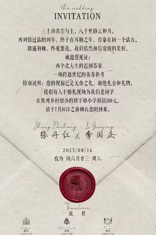 该请柬显示,婚礼将于2025年8月16日北京举办婚礼,男方为李国庆,女方为李国庆北大校友张丹红。